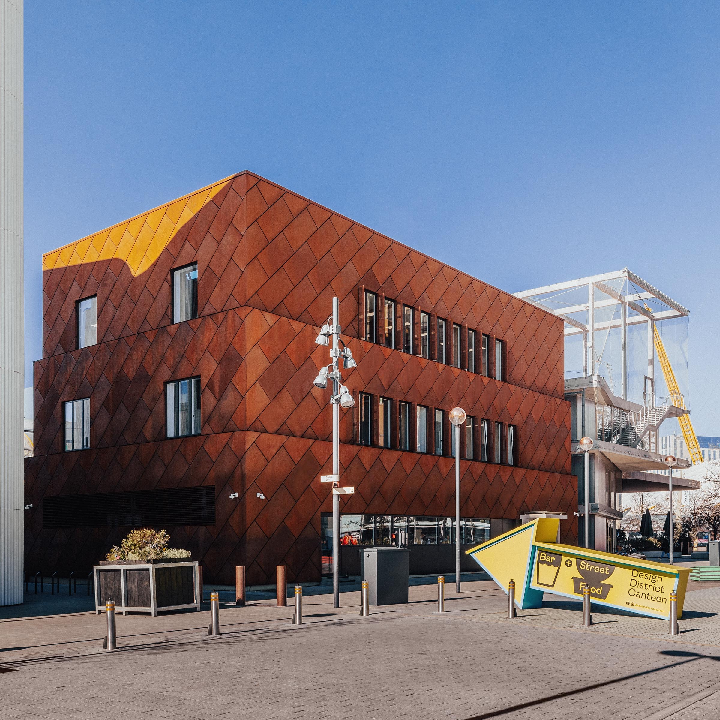 Designed by creatives, for creatives, the District's houses work & breakout spaces, wellness areas, including London's only rooftop basketball court, private event areas, a restaurant, and a street food hall, across a cluster of 16 gloriously eclectic buildings, designed by eight pioneering architects.