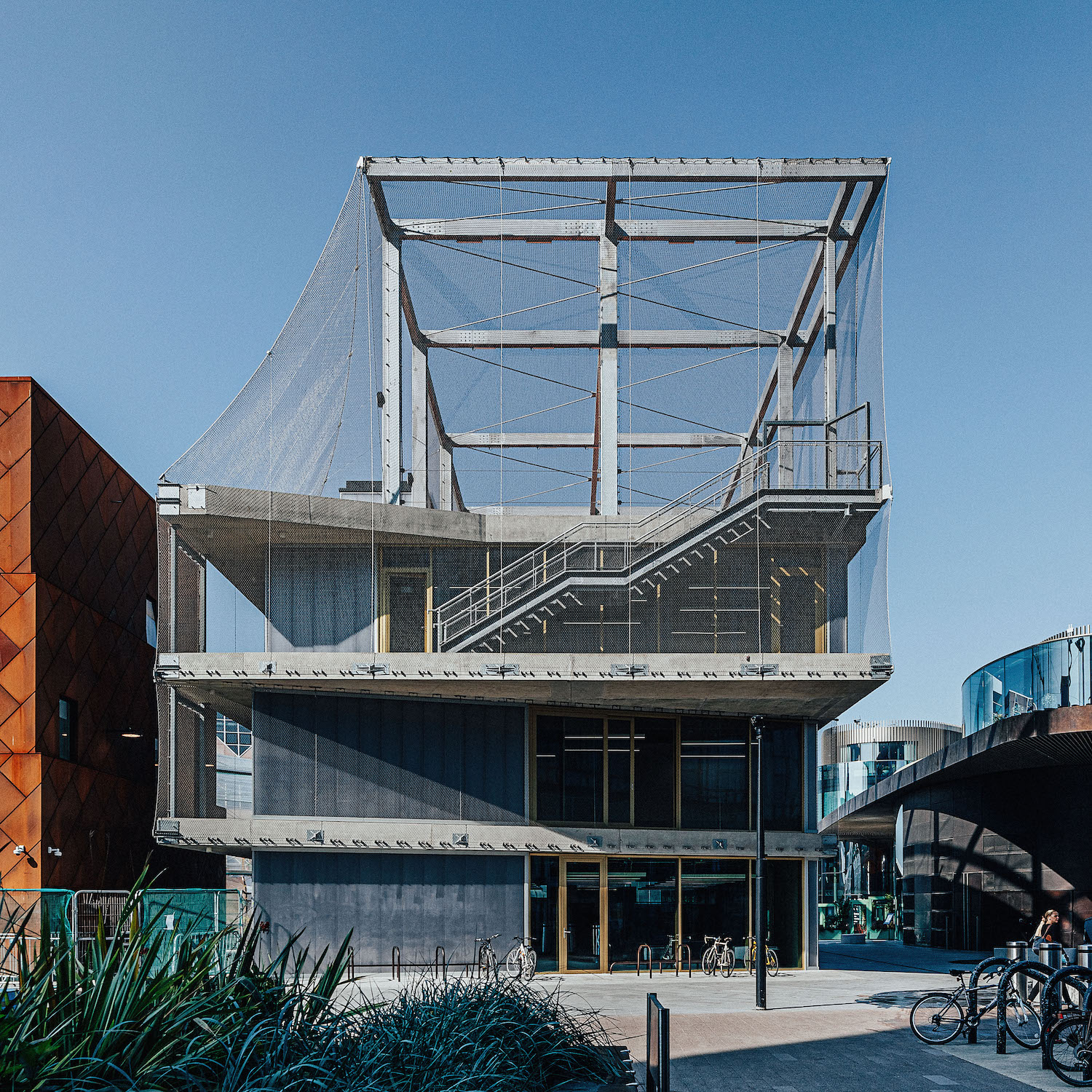 An open and welcoming building, intent on fostering community. A rooftop basketball court crowns three storeys of studio space, all accessible via open-air staircases doubling as communal spaces.