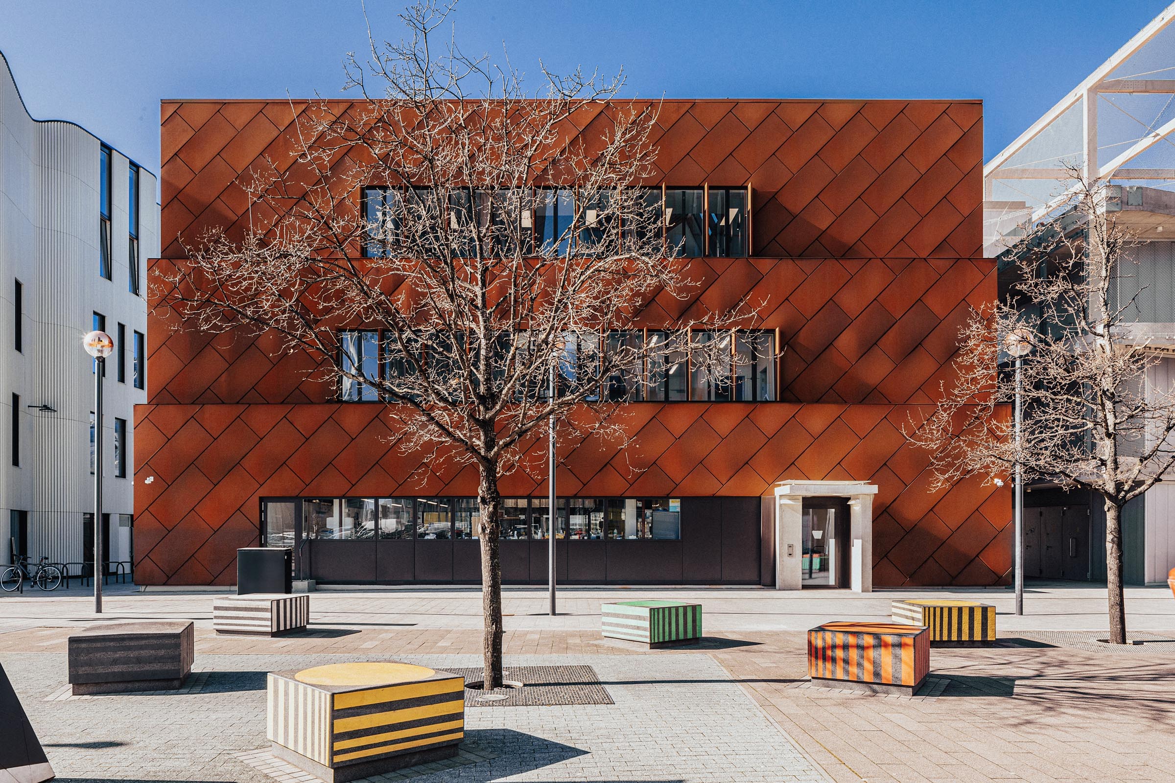 Ziggurat-shaped and clad in CorTen weathered steel, C2 makes a striking statement. The building is fitted out with a test kitchen and studios.