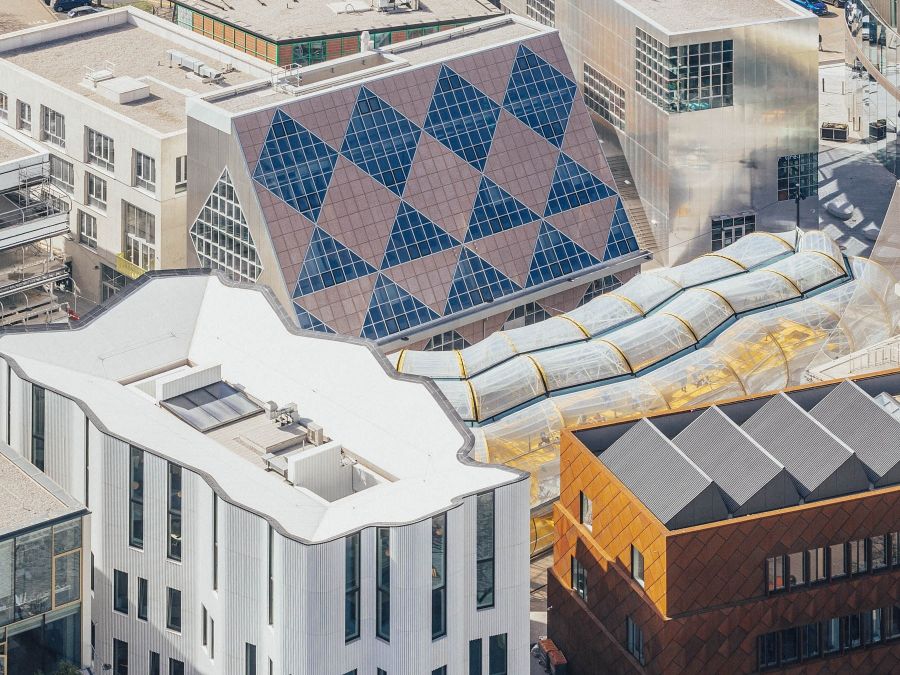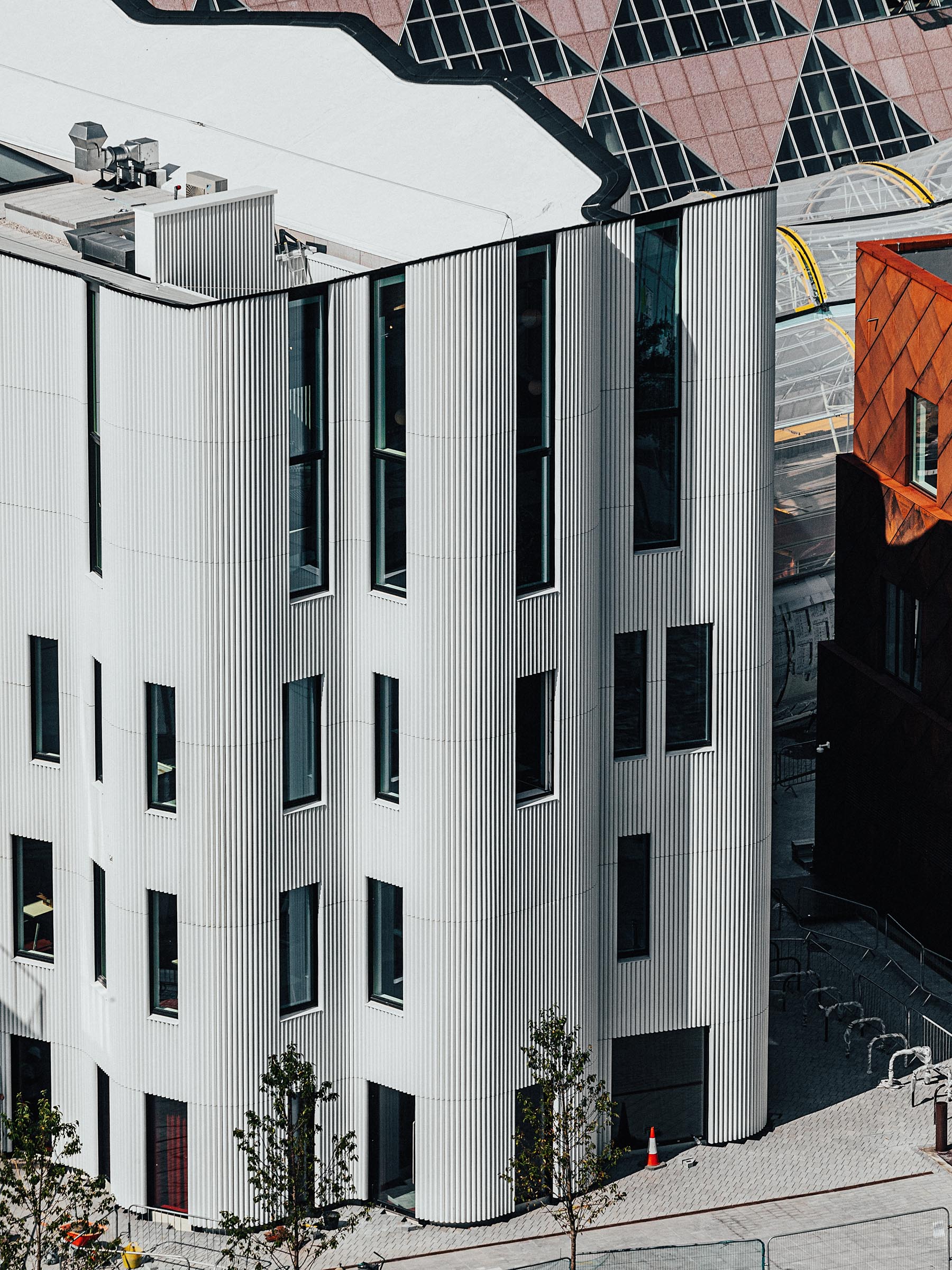 The two buildings by HNNA are distinct cousins. Each has a clean, white exterior that is interrupted by large windows of different sizes. C3 has an undulating shape that creates informal pockets of space inside. The windows in its irregular facade provide many different views of the Design District and the surrounding park. The top floor has an inward falling roof that creates two small courtyards for members to enjoy. D3 will be completed after the Silvertown Tunnel has been built.
