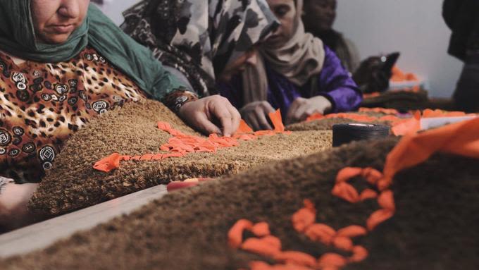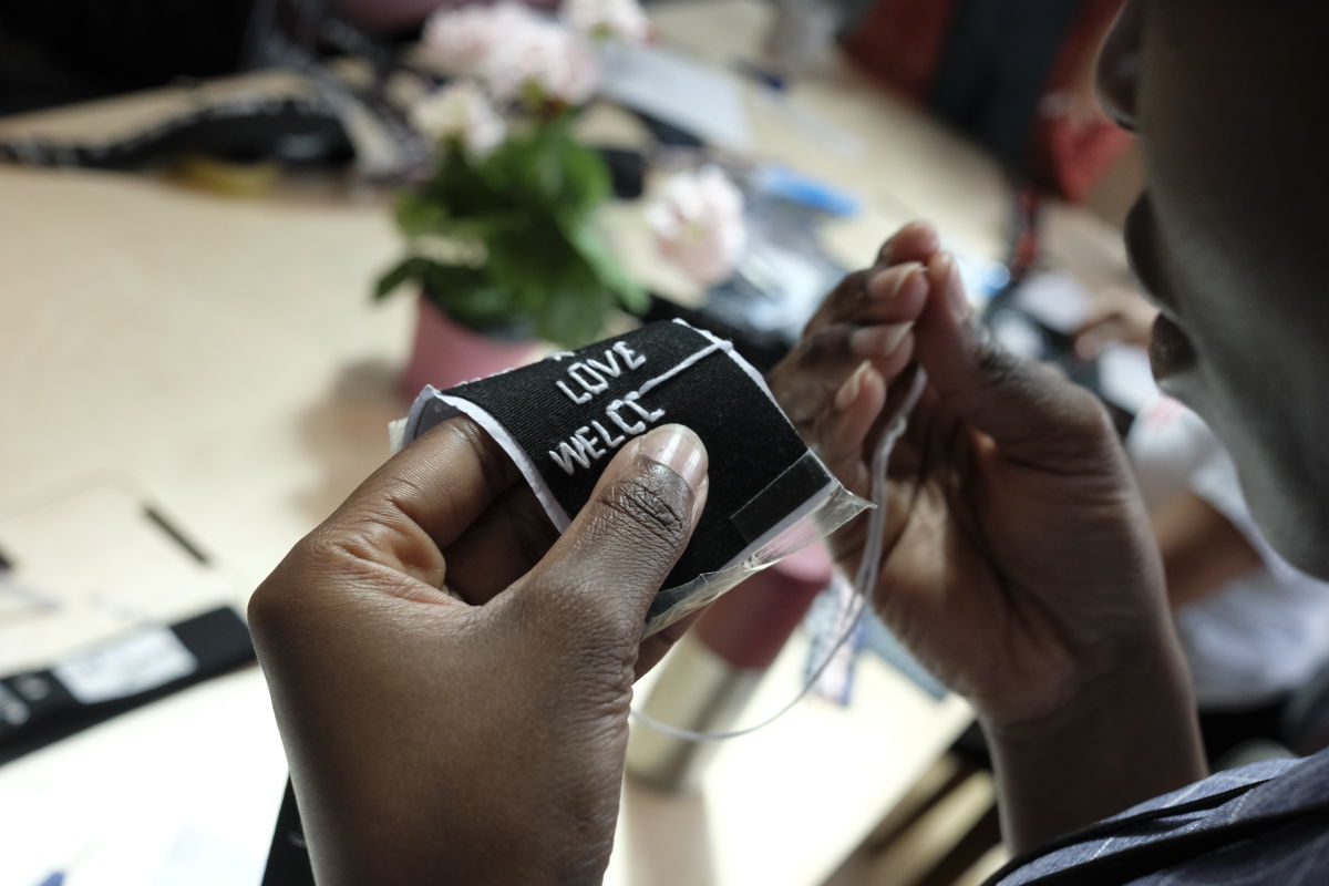 Since its founding in 2017, Love Welcomes’ products and good work have drawn much attention, leading to collaborations with the likes of Banksy and The Edge. The artist and guitarist have worked with Abi and her team to produce an exclusive welcome mat and a guitar strap, each made by refugee women and featuring strips of upcycled life-vest worn in perilous journeys across the Mediterranean.